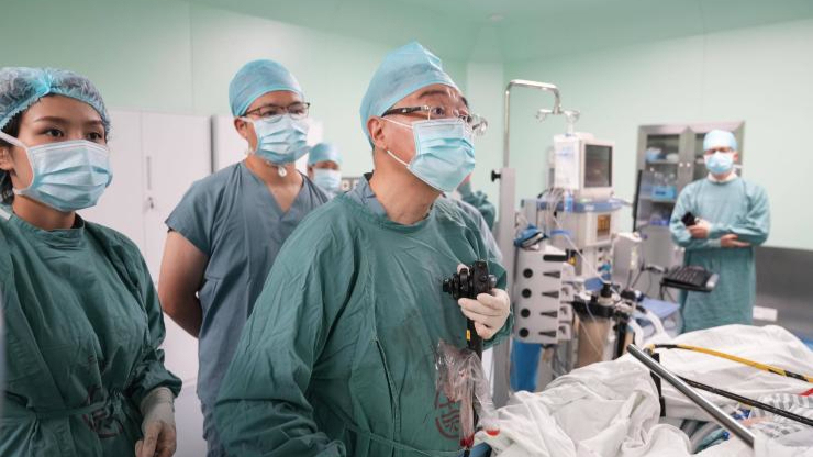 手术开始前,该团队蔡明琰副主任医师进行超声内镜精准定位,为建立黏膜下隧道指明方向。在全麻下,周平红教授熟练运用内镜领域先进的“隧道技术”,先切开胃壁,再将内镜穿过小网膜囊,进入腹腔——这一步相当于为内镜“开辟”了一条直达病灶的微创通道。