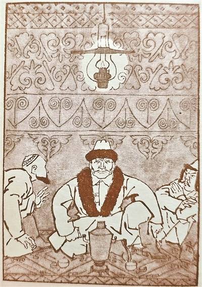 在《沙尔拜回来了》一章里,双方对峙场景的冲突刻画,也同样展现出了文图共鸣的深厚功力。文字以阿尔布满金的蛮横与牧人的畏怯构建戏剧张力,叶浅予便以“刚柔对比”笔法精准承接,阿尔布满金用粗重僵硬折线勾勒,眉骨凸起,眼神凌厉,指节因握鞭而棱立,皮袍线条硬挺,尽显蛮横霸道;背景牧人群体以模糊细碎线条刻画,无清晰面容,多低头避让。刚劲与柔弱线条的尖锐对比,契合“压迫与被压迫”的核心,让抽象矛盾直观具象,极具情感穿透力。