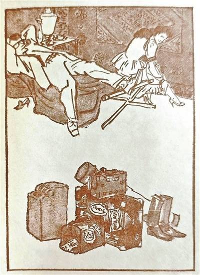 仔细想来,这种惊艳抑或更来自“违和感”所带来的突破性价值。半个多世纪前的插图创作中,女性形象常陷入“正面高大”或“负面妖冶”的脸谱化误区,人物特质被单一化、标签化。叶浅予却跳出藩篱,让尤丽成为以装扮传递诱惑、以姿态藏匿心事的立体个体。烫发弧线是柔媚与算计的共生,高跟鞋直线是疏离与试探的表达,每笔都承载多重特质,让这个游走在阴谋边缘的女性角色,既不令人全然憎恶,也不引人盲目同情,而是充满了复杂个性的“这一个”。比较他1957年为《子夜》绘制的插图,彼时其笔下的林佩瑶等女性形象,多以流畅曲线表现柔美气质,性格直白且符号化,他晚年也自省当时“用笔不够简练,多流于表面描摹”(《叶浅予回忆录:细叙沧桑忆流年》)。而此次对尤丽的刻画却实现了艺术超越,服饰不再是单纯的装饰元素,肢体也非简单的动作呈现,两者共同成为深挖人物特质的艺术手段,彻底摆脱文字“附属品”定位,成为能够独立传递情感、塑造人物、诠释主题的艺术载体。在我看来,这份艺术勇气其实比单纯的美感更具震撼力。