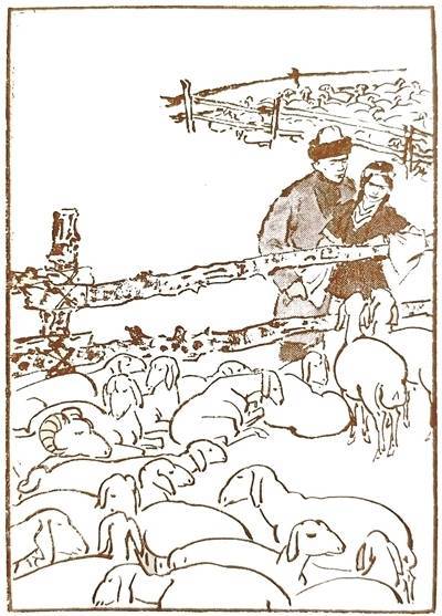 对草原温情场景的描画,与尤丽形象形成鲜明对比,让文图共生的惊艳更显多元。初版以细腻文字铺展草原青年爱恋,为宏大叙事注入人性温度。叶浅予的墨线也随之放缓节奏:羊群以圆润墨线绘就犹天边云朵,背景木栅栏上斑驳点点似有苔痕,尽显草原生活原生态的质朴;人物的衣褶疏密有致,似能触到羊毛衣衫的质感;相拥的青年男女姿态亲昵,使情感更显真实。这让观者在体会刚劲历史与密谋叛乱画面的紧张之后,再目睹这份柔情,不仅可稍稍感到一点轻缓,也更能感到文图共生的丰富张力。